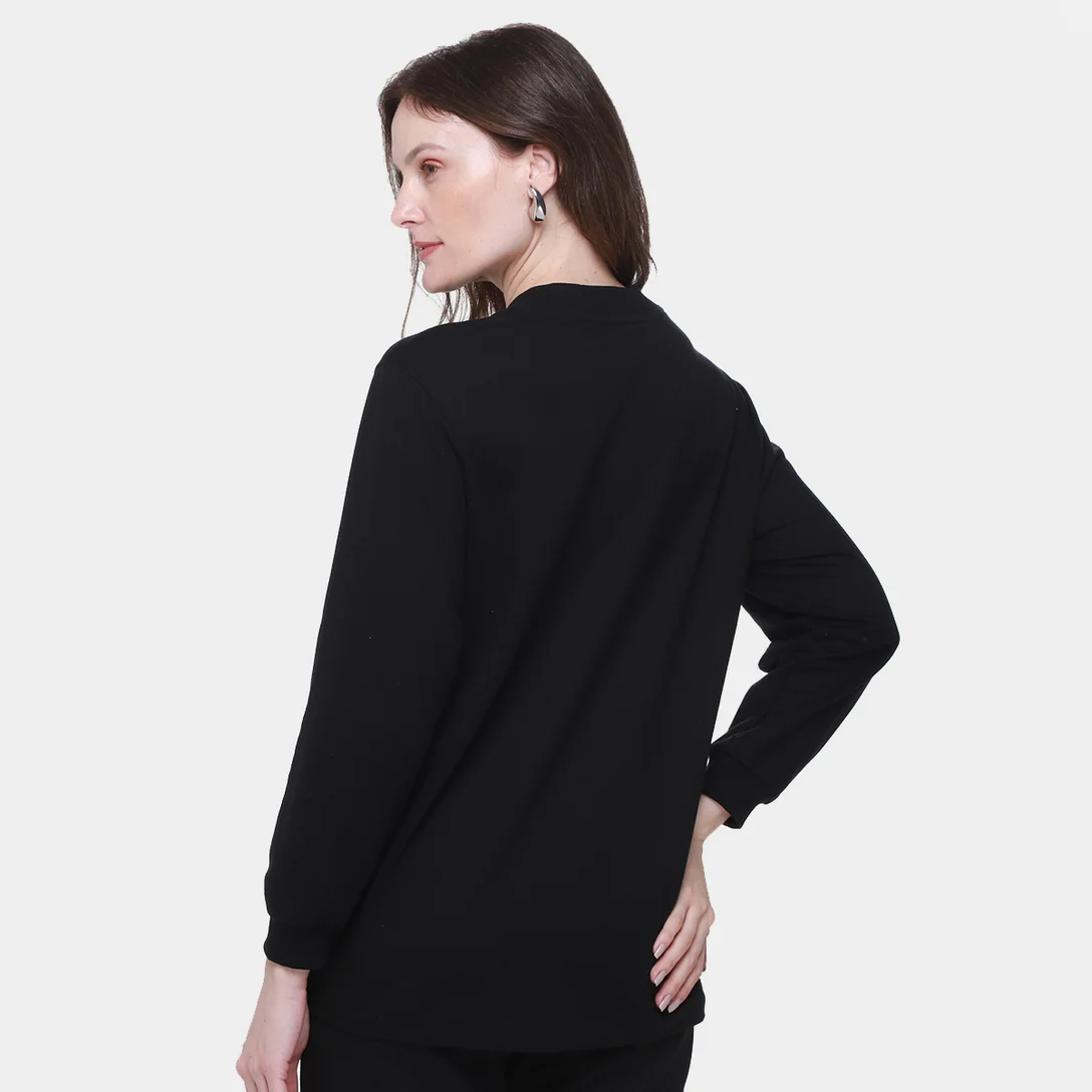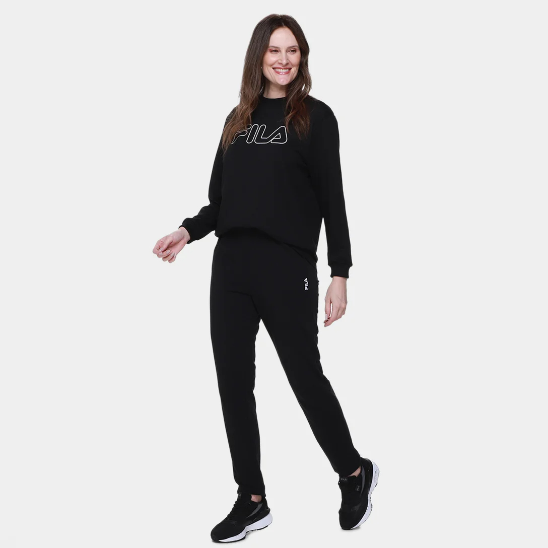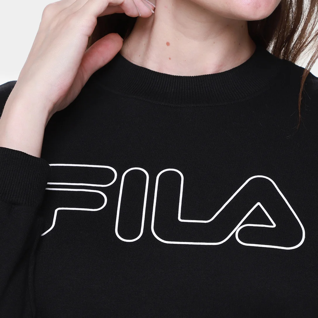 Buzo de mujer confeccionado en felpa de algodón y poliéster. Corte holgado y cómodo, con cuello redondo acanalado y mangas largas. Presenta puños acanalados, pespuntes, bajo delantero más corto y un estampado grande de la letra Fila serigrafiada en el centro de la parte superior delantera.