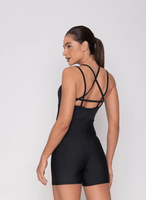 Lo más destacado de esta pieza es la espalda. Los tirantes se entrecruzan en un delicado patrón geométrico, creando un detalle visual que añade sofisticación al look. Esta espalda cruzada, con varios tirantes finos, logra un equilibrio entre sensualidad y practicidad, manteniendo el mono ajustado sin comprometer la libertad de movimiento. La abertura trasera aporta un toque de ligereza y frescura, ideal para ocasiones donde la comodidad y la ventilación son importantes.