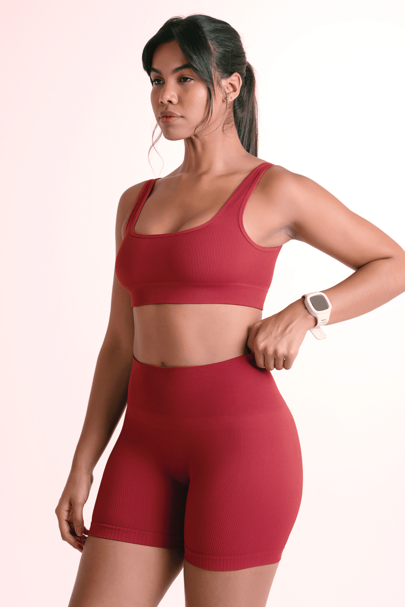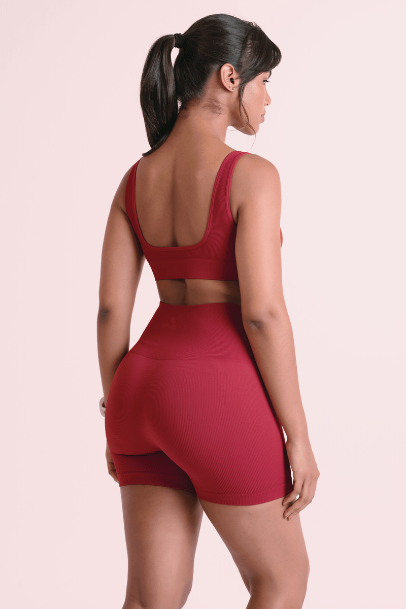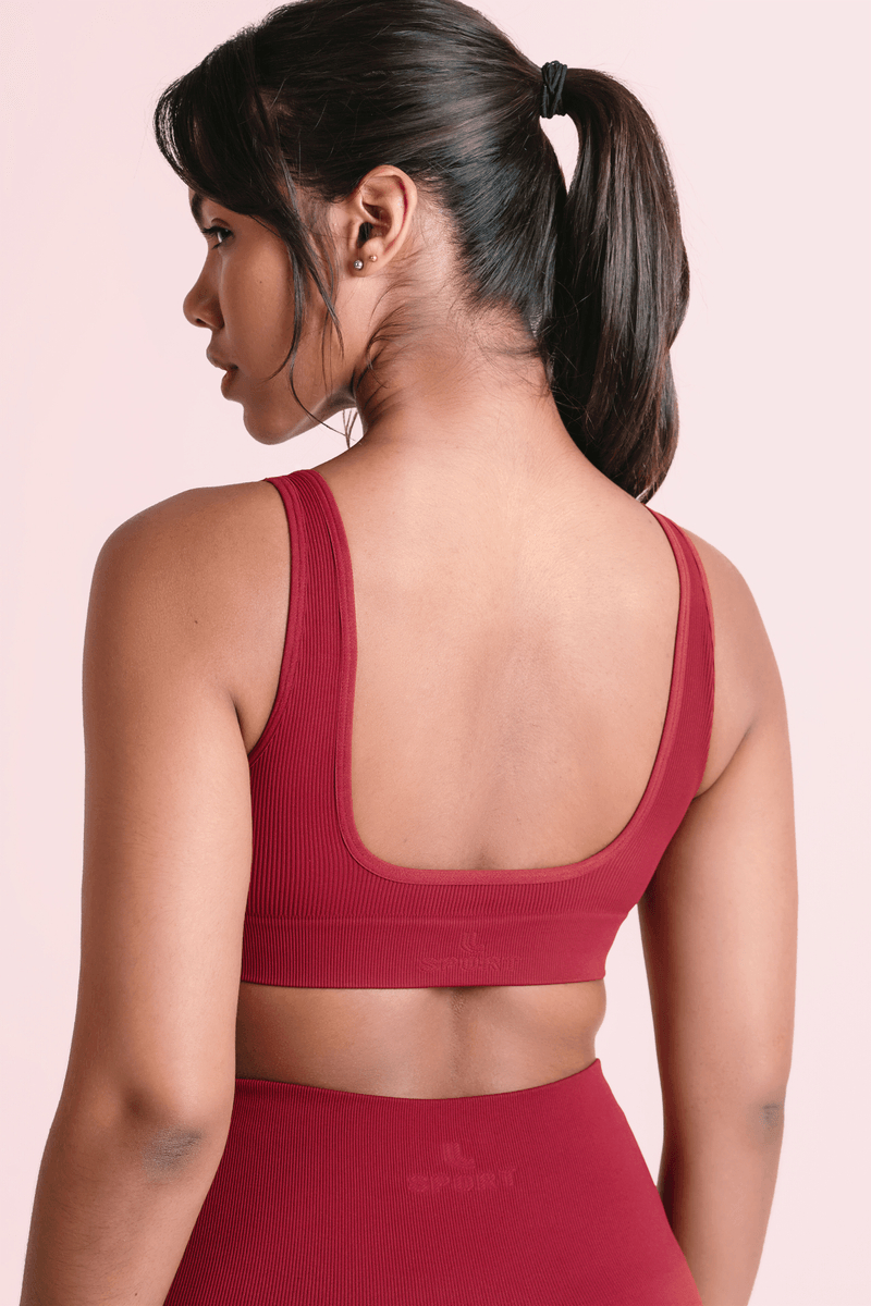 Top sin costuras con estructura acanalada. Presenta un escote cuadrado en la parte delantera y un escote ligeramente más pronunciado en la espalda. Sus tirantes anchos proporcionan un ajuste más seguro y cómodo. Ofrece una sujeción ligera, ideal para actividades físicas o incluso para uso casual y urbano.